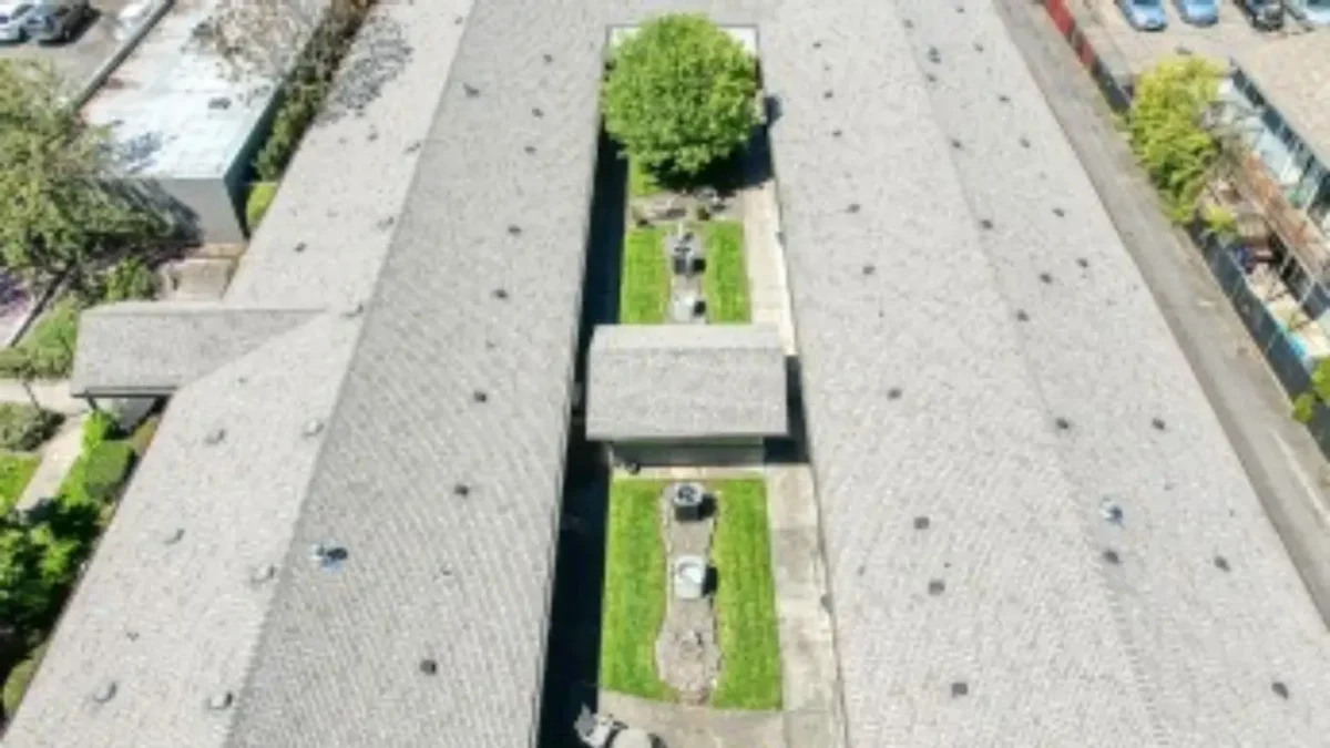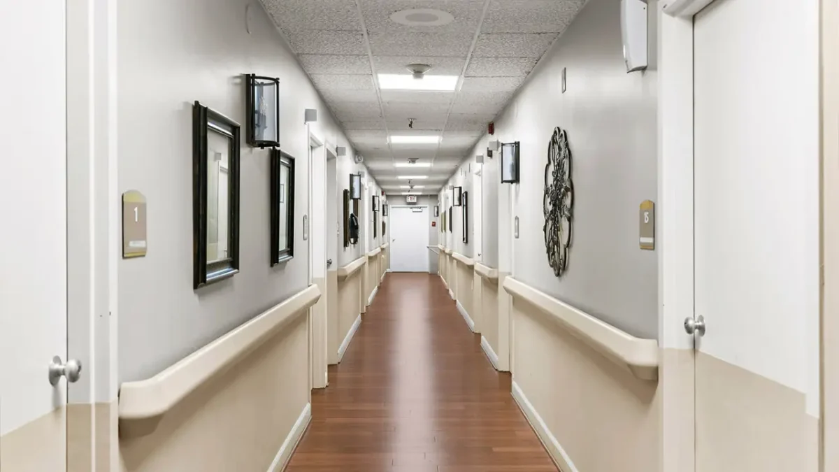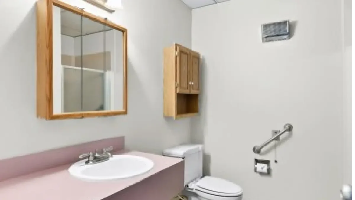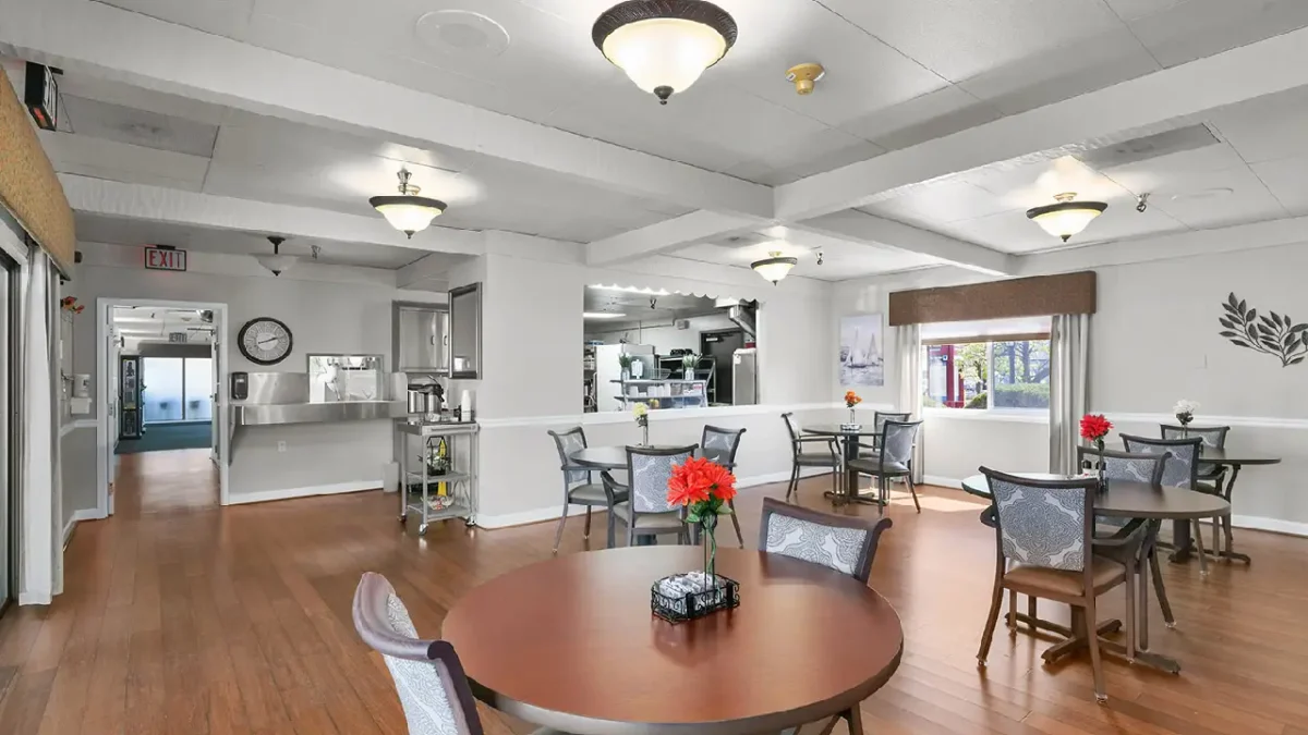 Retirement Community at Gateway Care Center Portland, OR The front entrance of a building with a covered walkway, a stone facade, and a walkway surrounded by green bushes An aerial view of two rows of buildings with gray roofs, separated by a grassy courtyard with a tree and a fountain A courtyard area with a large green tree in the center, a decorative fountain, benches, and buildings on either side The exterior of a two-story gray building with a sign that reads Waterman House, surrounded by well-manicured hedges A courtyard with a grassy area and a patio with a table and chairs, between two buildings with dark roofs and siding A courtyard area with a large tree, a path, and two white rocking chairs on a patio next to a building A grassy courtyard with a large tree, a small table with two chairs, a bench, and two buildings with black and white siding A living room with brown couches, a coffee table, a television, and large windows leading to an outdoor patio A well-lit, narrow hallway with wooden flooring, framed pictures on walls, and numbered doors on either side, leading to an exit A beautiful bedroom A living area with a brown couch and armchair, a small black fireplace, and decorative elements on the wall A living room with gray carpet, two brown armchairs, a brown couch, and a mirror on the wall A dining room with round wooden tables, chairs with patterned backs, and large windows leading to an outdoor patio A dining area with wooden floors, several tables and chairs, and a pass-through opening to a kitchen area in the back A dining area with a wood floor, several tables and chairs, a mirror on the left, and a fireplace in the back A living area with a light blue couch and armchair, a TV on a stand, and a picture on the wall A meeting or conference room with a large dark table and rolling chairs, a light gray couch, and two light blue armchairs, with a television mounted on the wall An outdoor area with two wooden benches, a concrete patio, and a ramp with a black handrail next to a brick building a toilet with mirror A white theme toilet with mirror inbuild